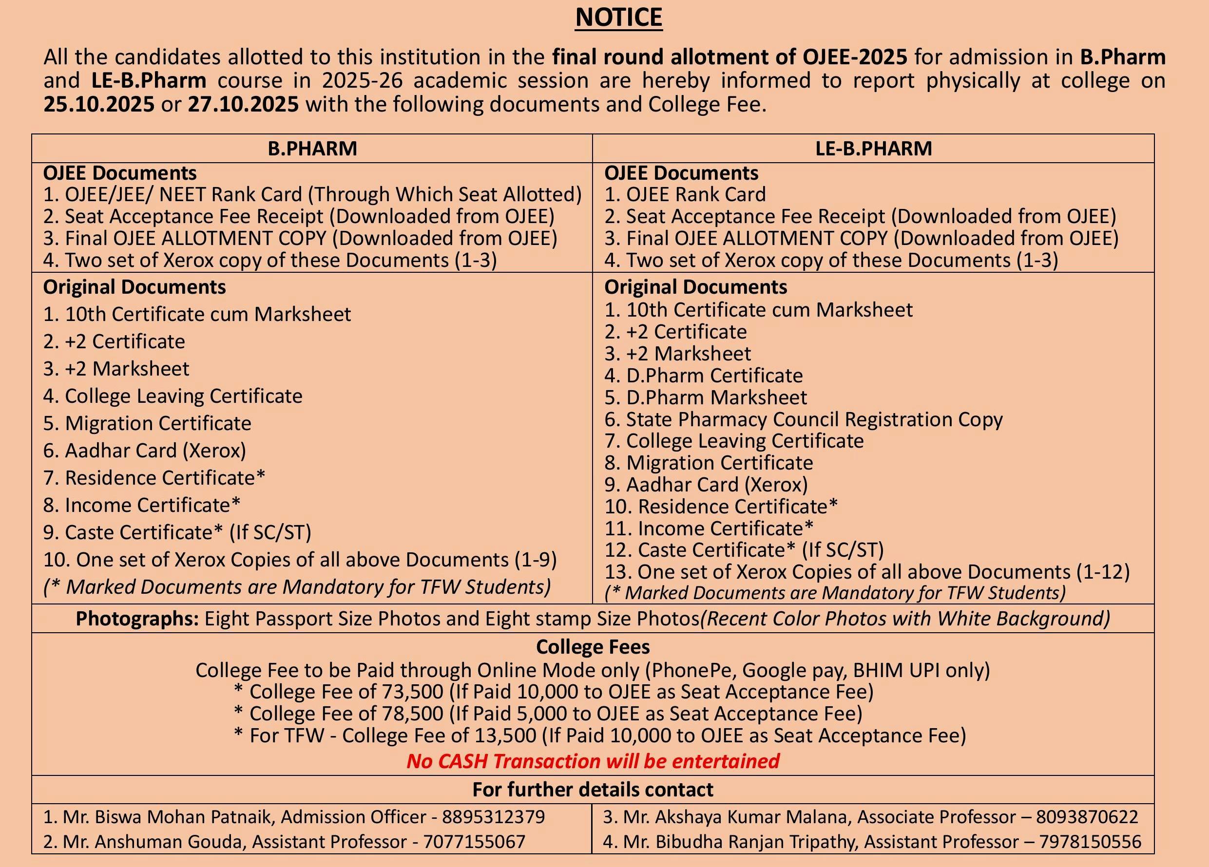College of Pharmaceutical Sciences, Berhampur is the oldest self-financing pharmacy institution in Eastern India established in the year 1979 by "Ganjam and Phulbani Chemists & Druggists Association" with D.Pharm and B.Pharm courses with an aim to generate technical human resource in the field of Pharmacy to handle the professional activities of dispensing of drugs by registered persons to meet the statutory requirements of section 42 of Pharmacy Act, 1948, in this state in particular and in the country in general besides aiming to cater the growing needs of health services, to serve the pharmaceutical industry in excellent manner, drug control administration, and to update the pharmacy profession in Education and Research and other allied arenas to meet the clarion call of health for all.